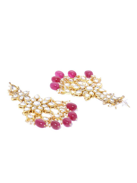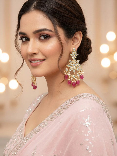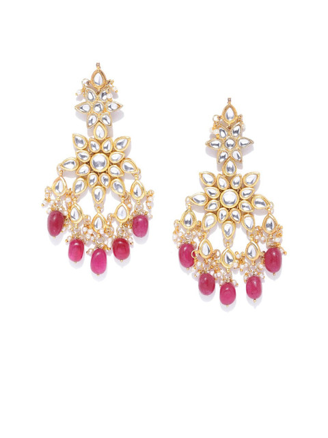 Magenta handcrafted floral drop earrings, gold-plated, has kundan stones and artificial beads