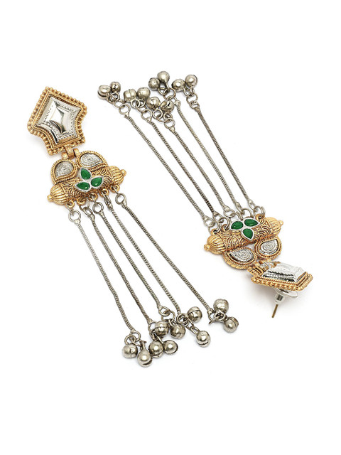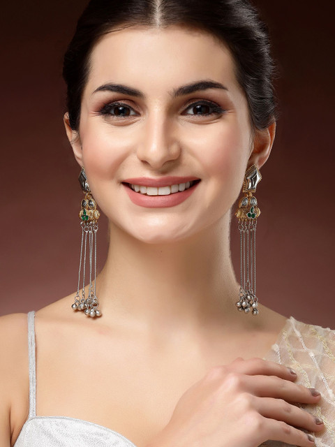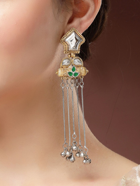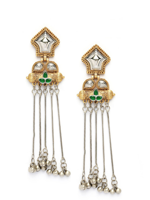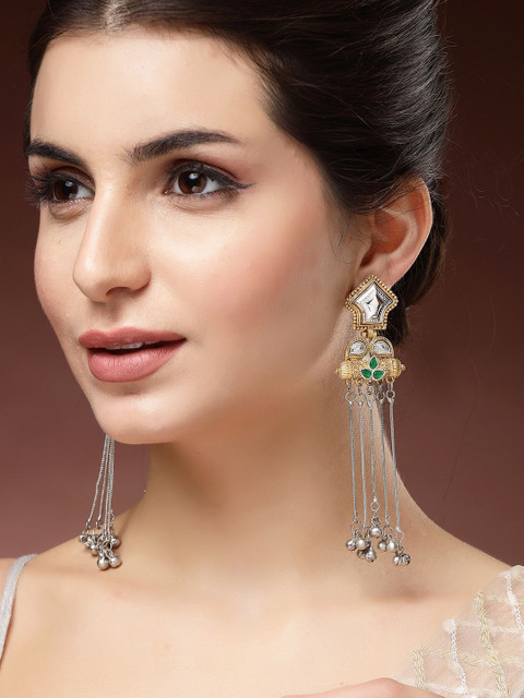 Green, gold toned contemporary drop earrings, silver-plated, has kundan studded