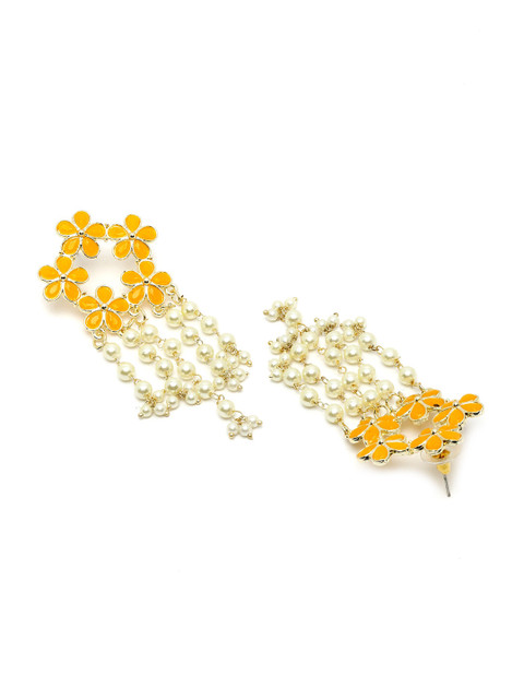 Yellow floral drop earrings, gold-plated, has kundan secured with a post and back