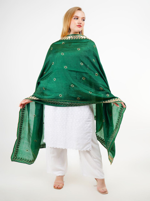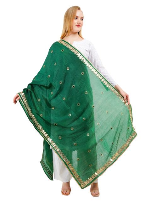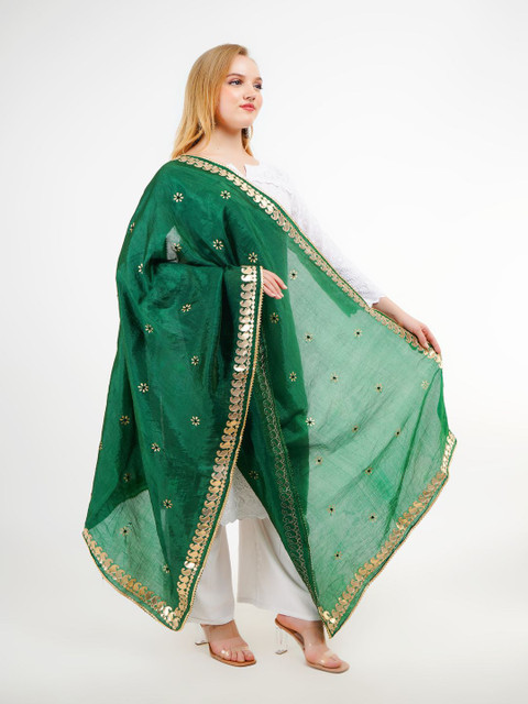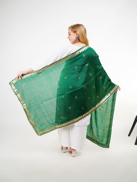 Green and gold-toned ethnic motifs printed gotta patti dupatta, embellished border