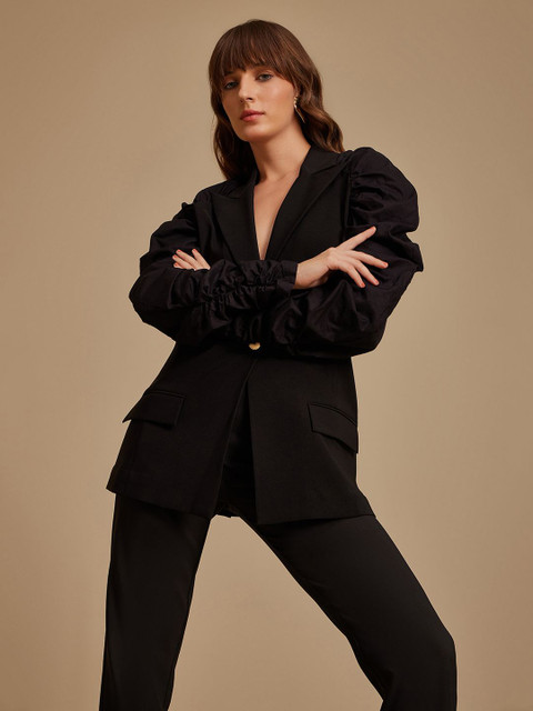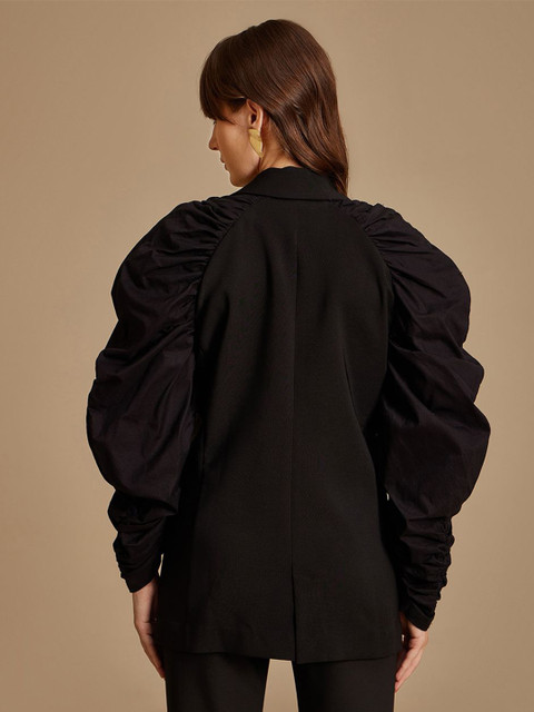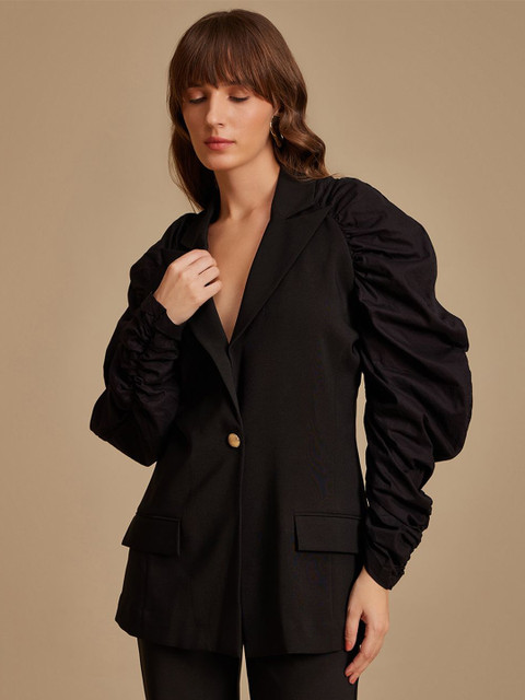 Black solid tailored-fit blazer, has a notched lapel, long Puffed sleeves, single-breasted with front open single button closure, two flap pockets and a Single-vented back hem