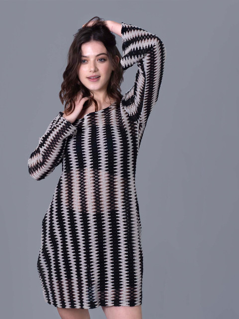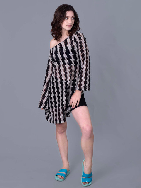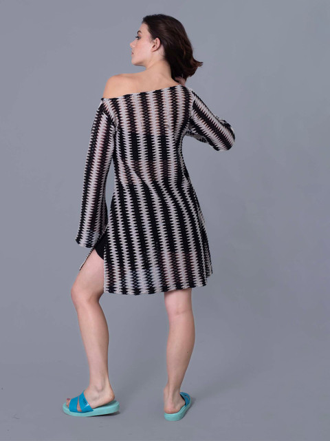 Black and white striped beach cover up top has off-shoulder neck & long sleeves