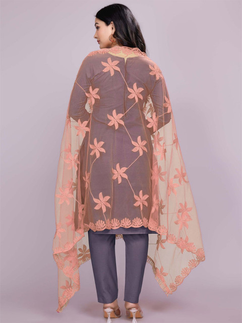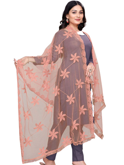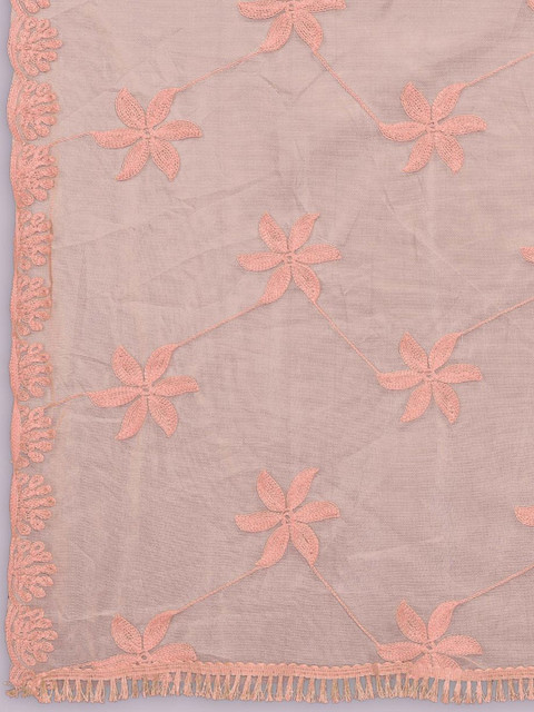 Peach floral embroidered dupatta, has thread work detail, fringed border