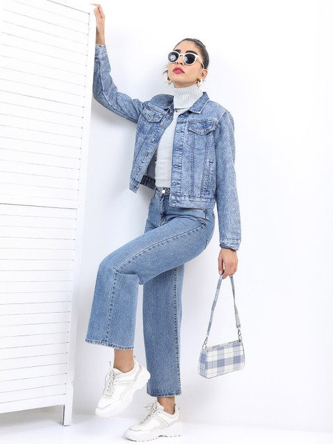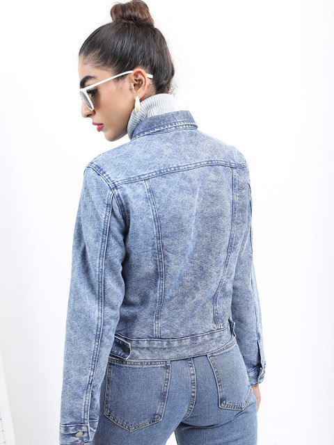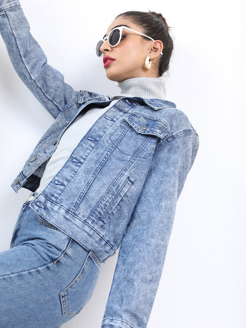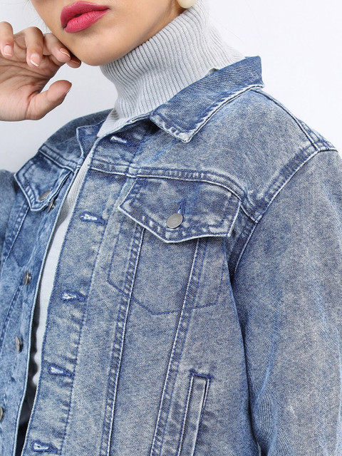 Blue washed denim jacket has a spread collar, 4 pockets ,has a button closure, long sleeves, curved hemline, without lining
