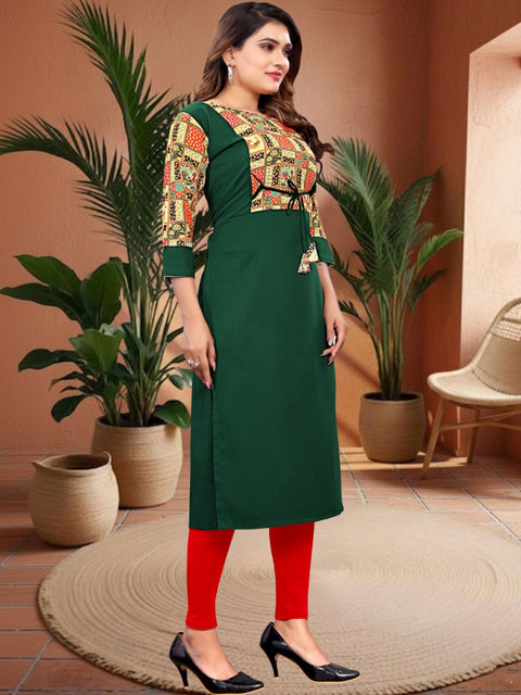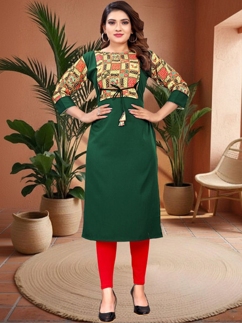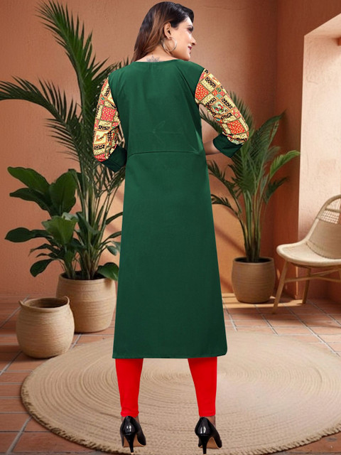 Women Green Patchwork Cotton Ethnic Straight Kurta 3/4 Sleeve Indo Western