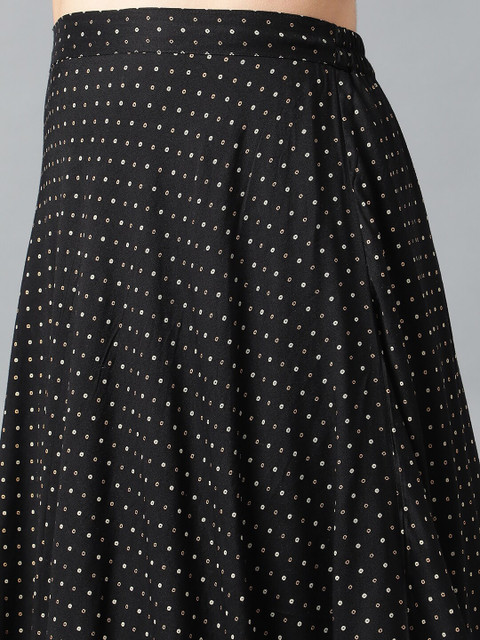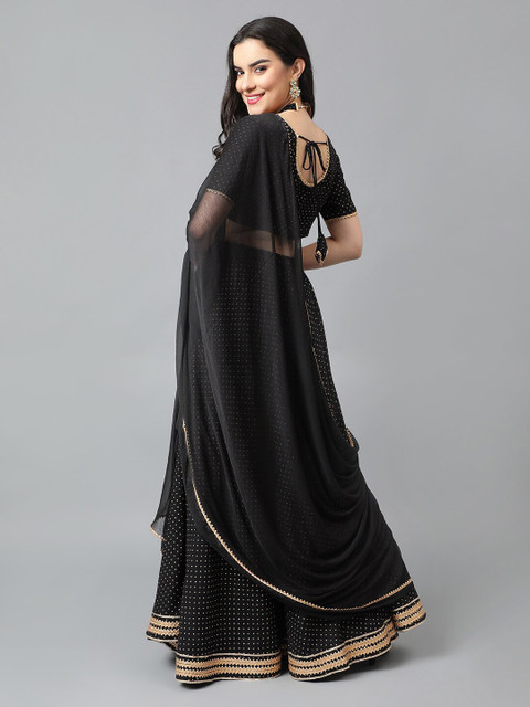 Black, white and gold-toned bandhani printed ready to wear lehenga, has slip-on closure, flared hem