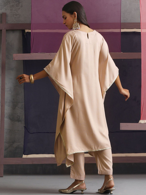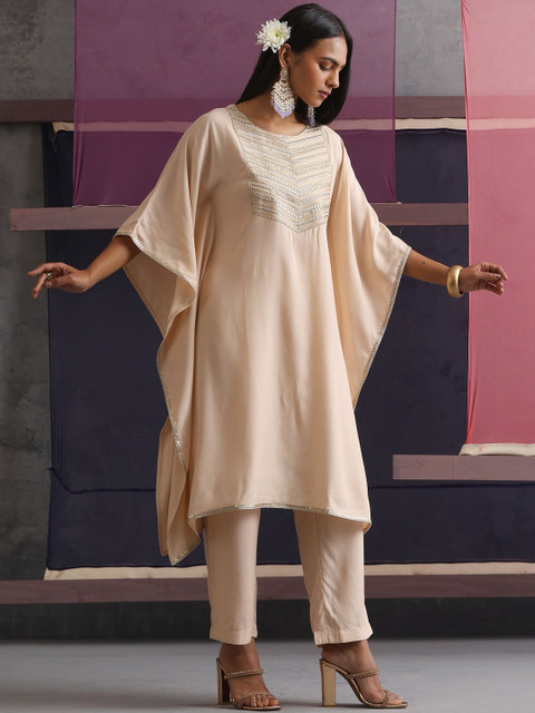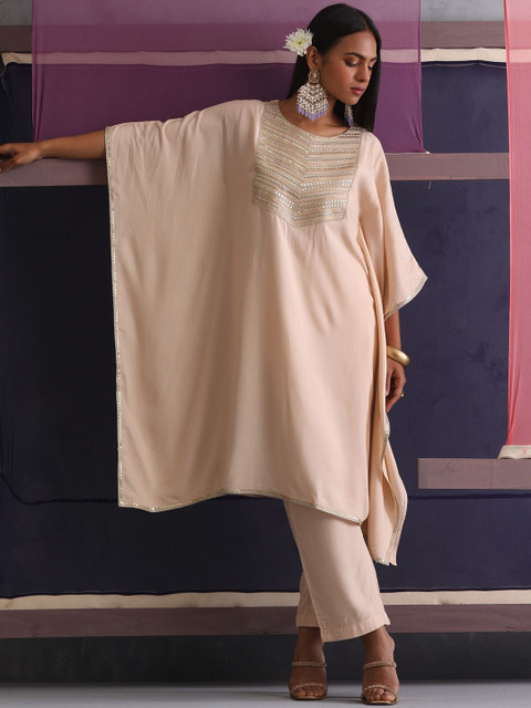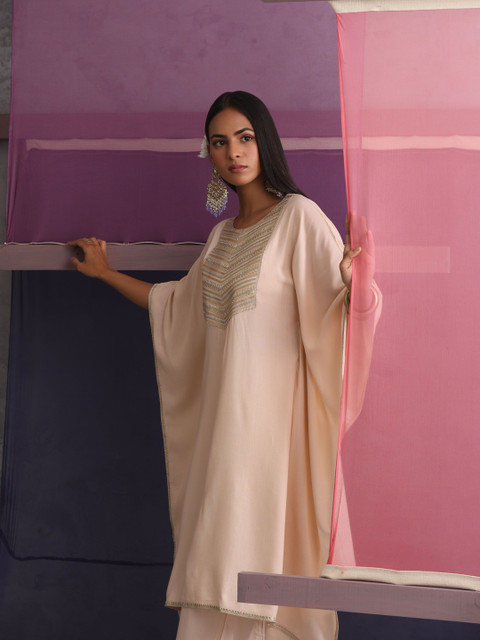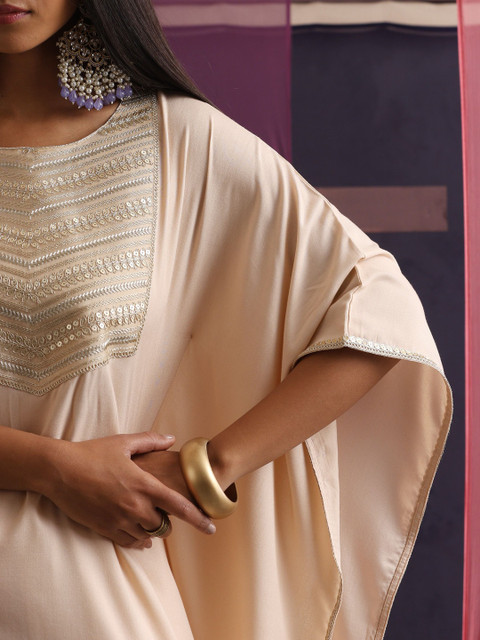 Beige embroidered top , has a round neck and three-quarter sleeves, secured with slip-on closure