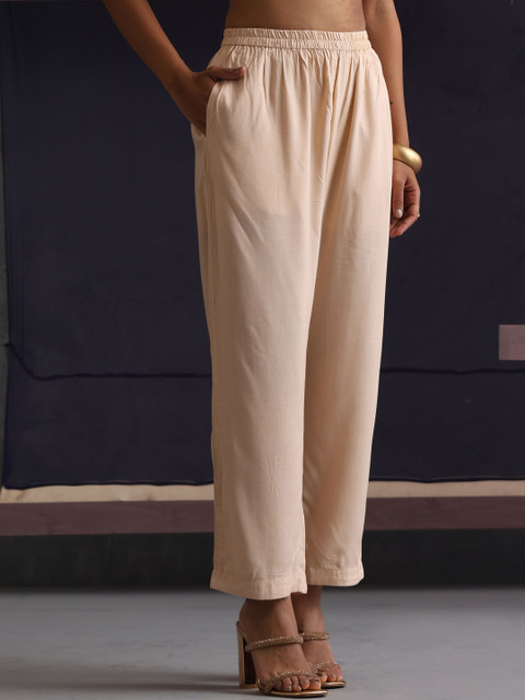 Beige solid trousers, has an elasticated waistband with slip-on closure has 2 pockets