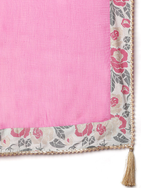Pink, green and cream-coloured Floral printed choli with dupatta, has gotta patti detail