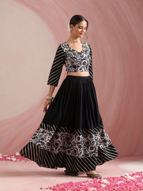 Black and white printed ready to wear lehenga, has slip-on closure, flared hem
