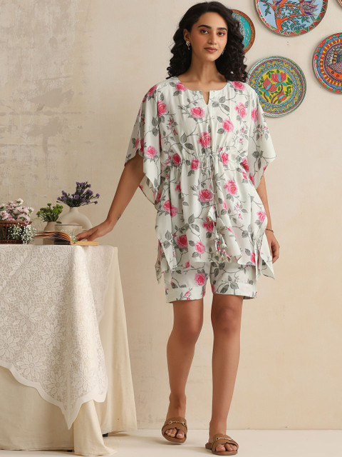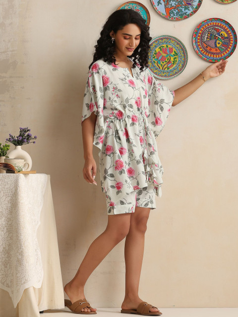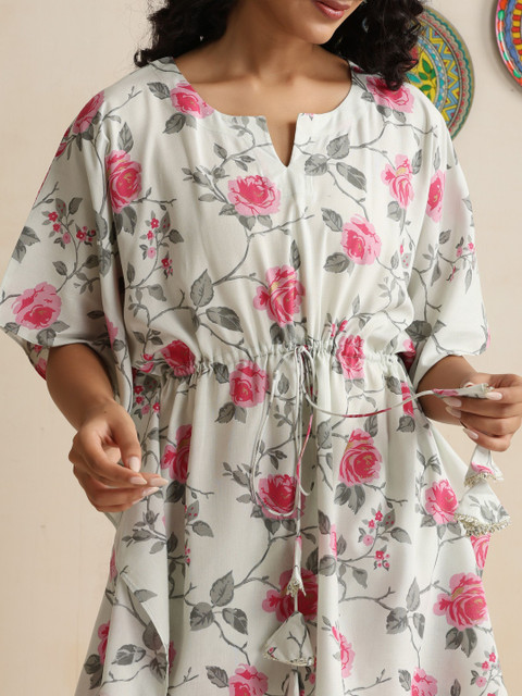 Off white floral printed kaftan , has a notch neck, has short, kaftan sleeves