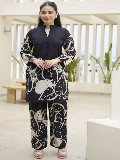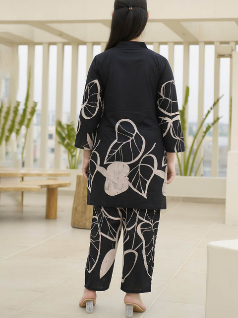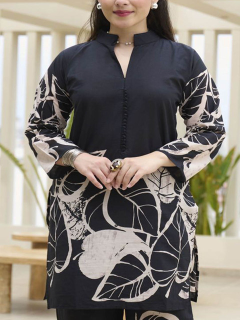 Black printed tunic has mandarin collar and three-quarter sleeves with slip on closure
