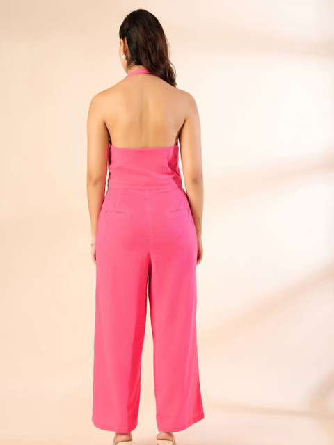 Pink solid basic jumpsuit ,has a halter neck, sleeveless, 2 pockets