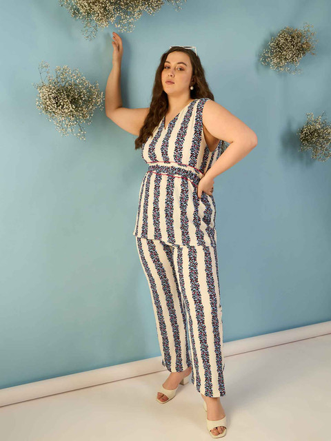 KIBO CURVE Plus Size Floral Printed V Neck Top With Trousers