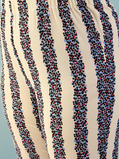 Off white, grey and pink printed trousers, has an elasticated waistband with slip-on closure