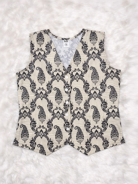 Style this printed cotton waistcoat with high-waist trousers or denim shorts and minimal accessories for an effortless smart-casual look.