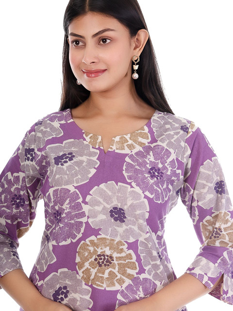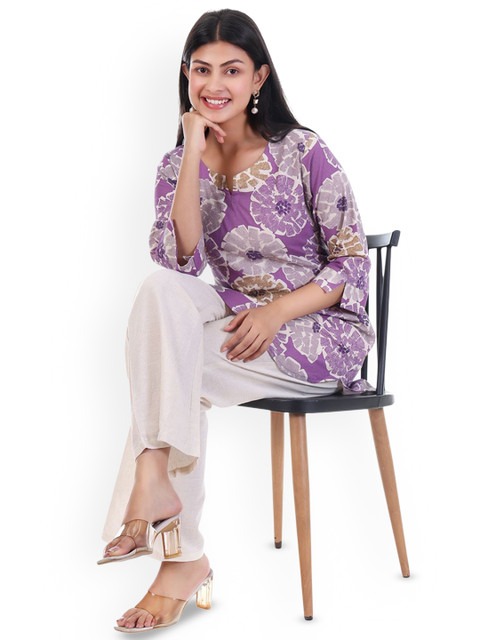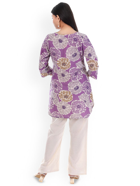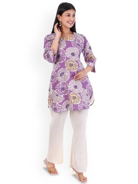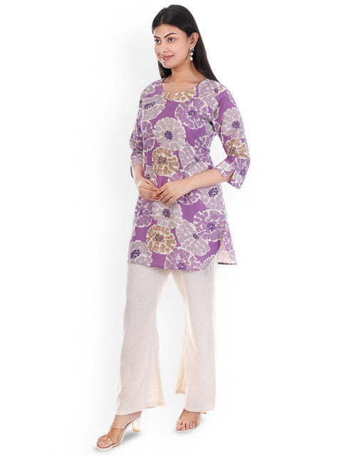 Mauve Printed tunic has a round neck and three quarters sleeves, secured with slip-on closure