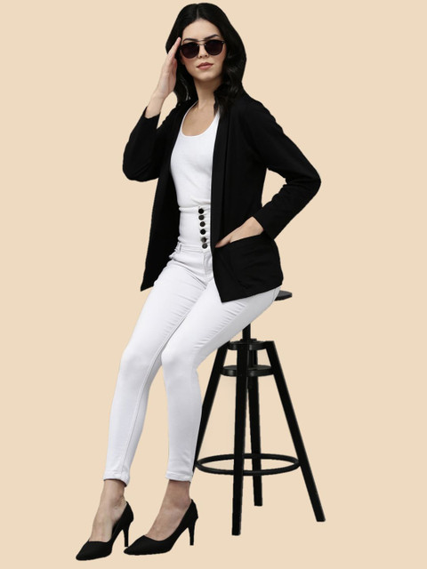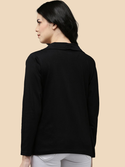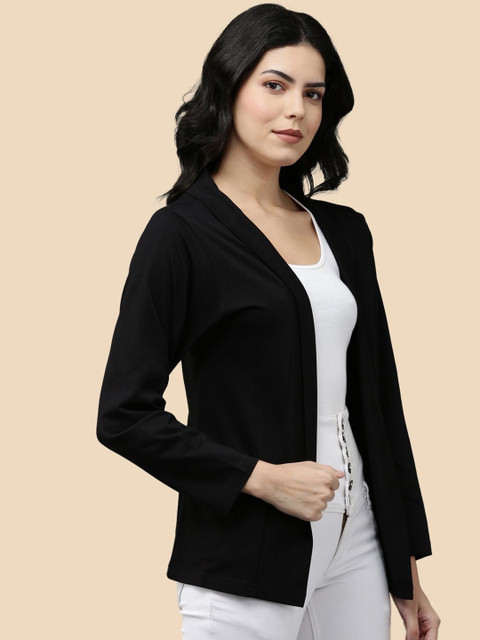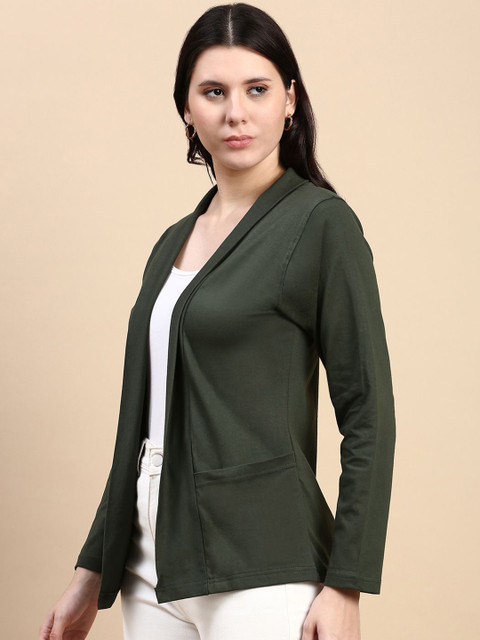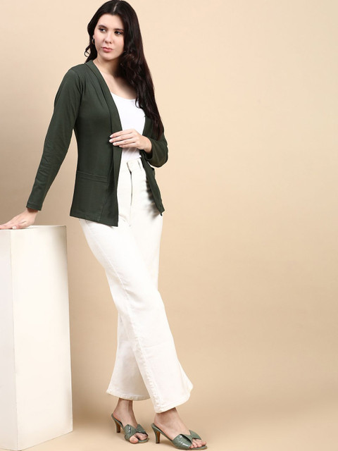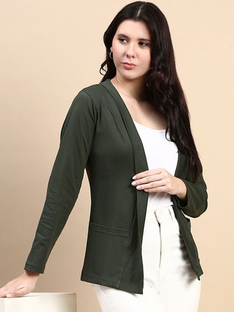 Black and Olive Green solid cotton open front regular length shrug with full sleeve and straight hem. Has 2 front functional pockets