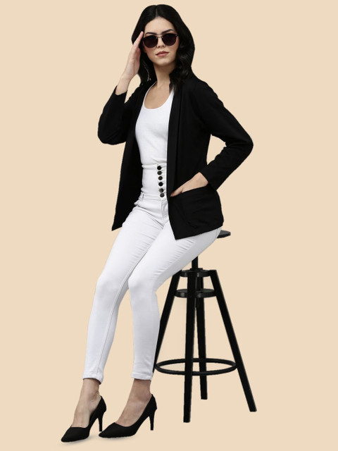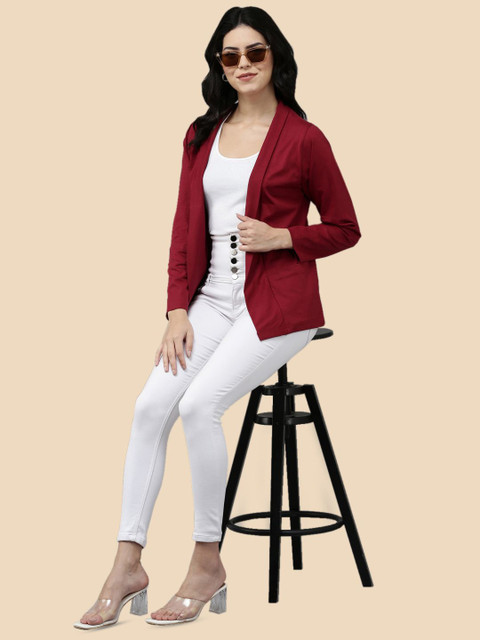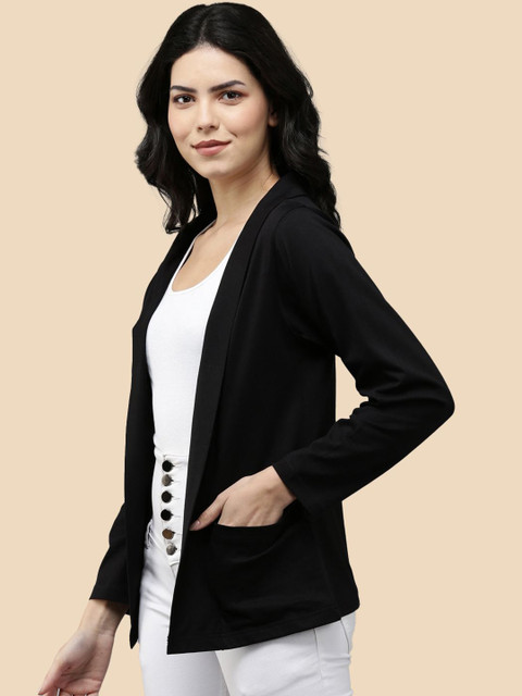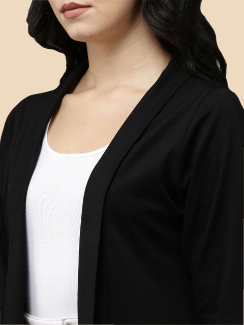 Black and Maroon solid cotton open front regular length shrug with full sleeve and straight hem. Has 2 front functional pockets
