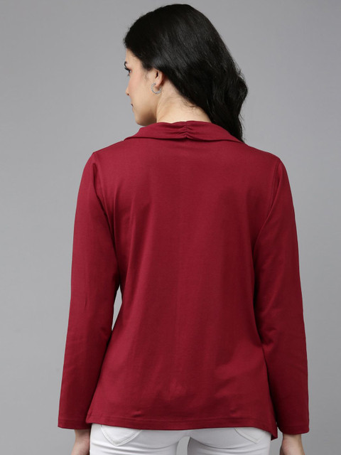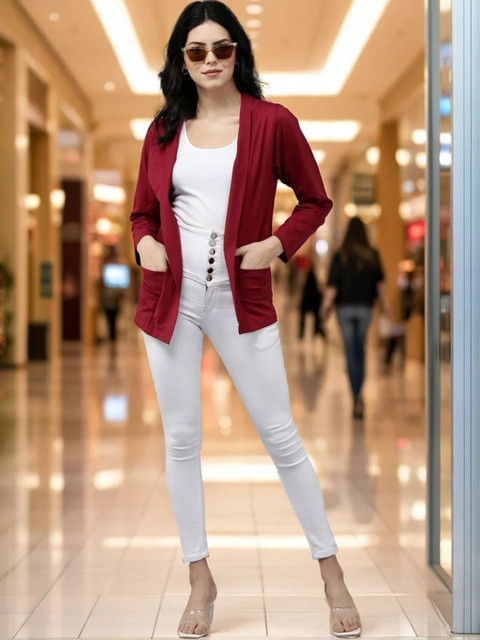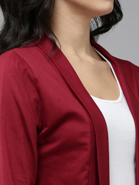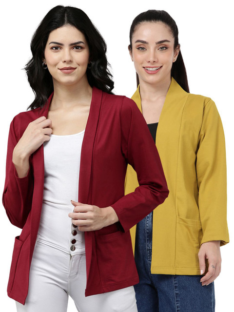 Pack of 2 Maroon and rust yellow solid open front regular fit cotton shrugs with 2 pocket for layering, has long sleeves, straight hem
