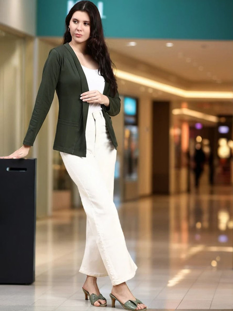 Olive green and off white solid open front regular shrug ,has long sleeves, straight hem