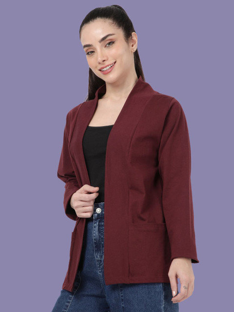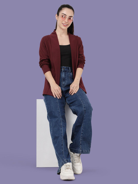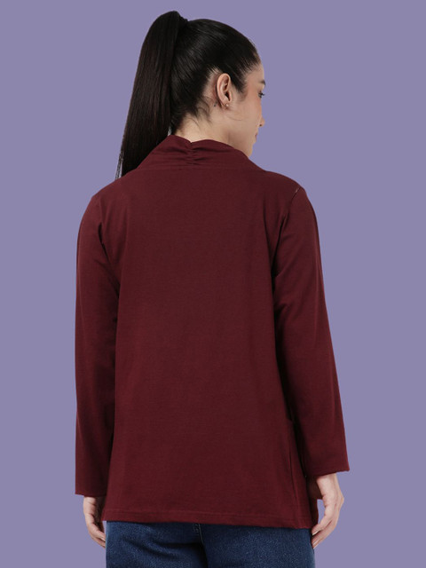 Maroon and burgundy solid open front regular shrug ,has long sleeves, straight hem