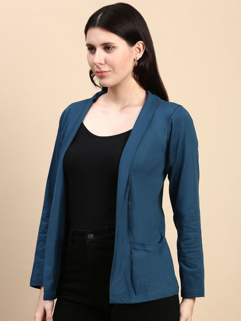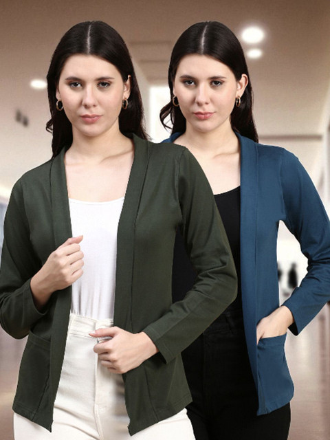 Pack of 2 Olive green and Teal Blue solid open front regular fit cotton shrugs with 2 pocket for layering, has long sleeves, straight hem