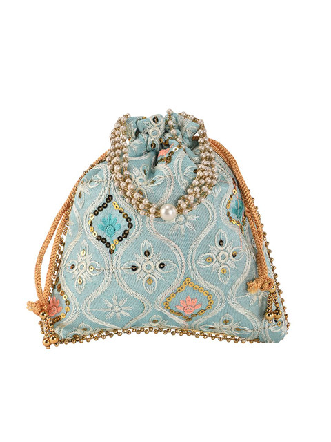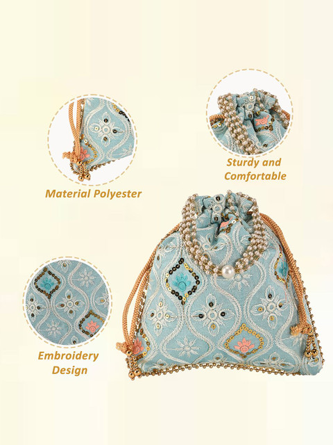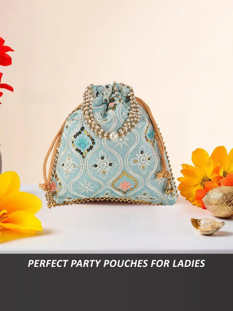 Beautiful potli bag with intricate embroidery and a classy pearl handle. Perfect for festive occasions and goes well with traditional outfits. Loved the quality and design! 🌸