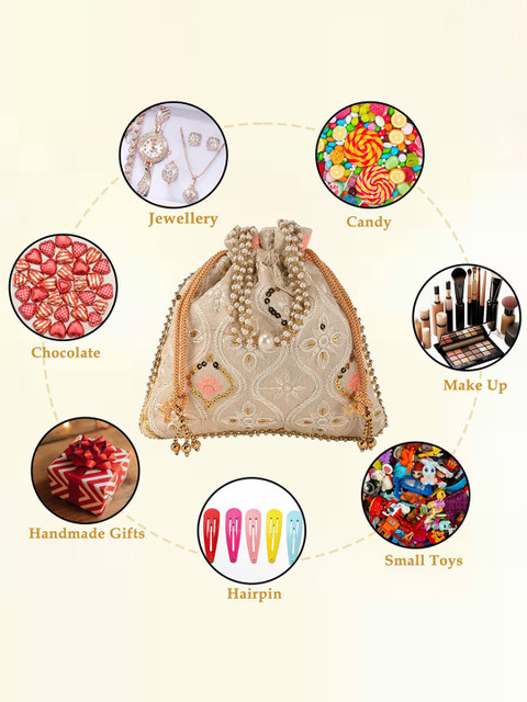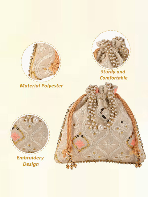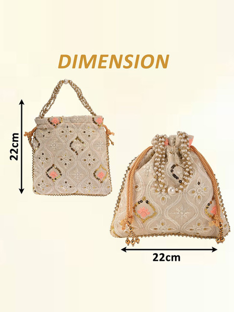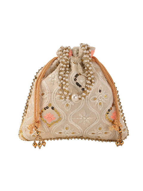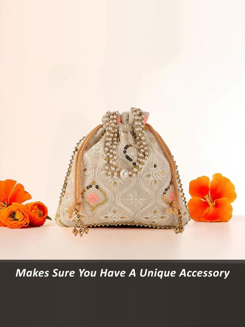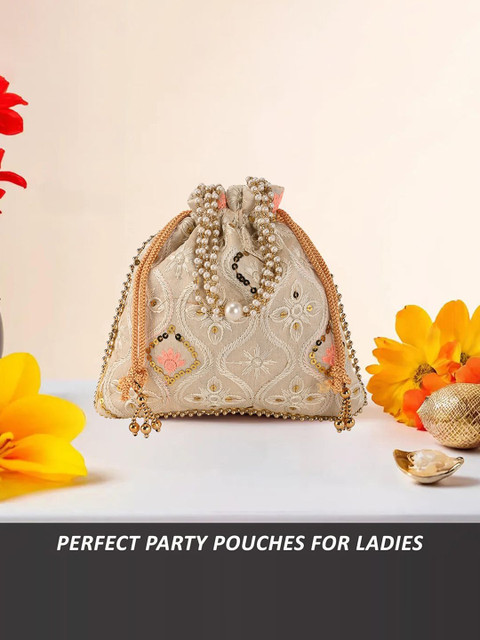 Beautiful potli bag with intricate embroidery and a classy pearl handle. Perfect for festive occasions and goes well with traditional outfits. Loved the quality and design! 🌸