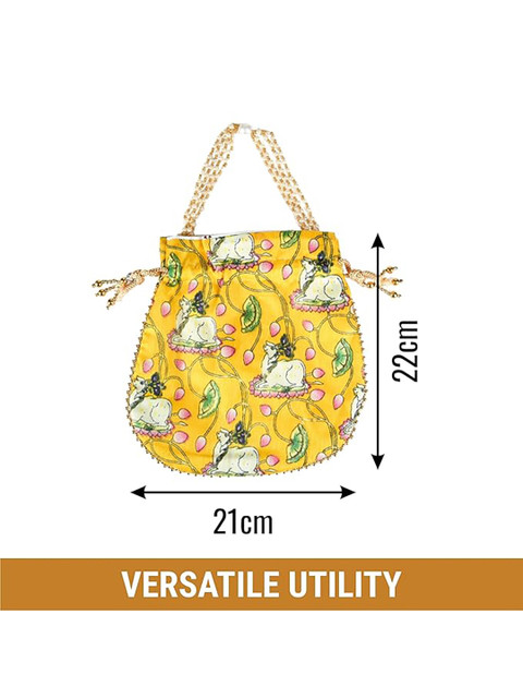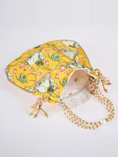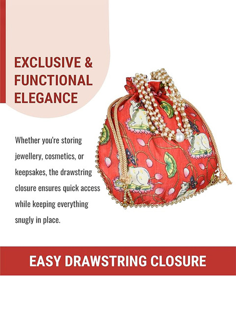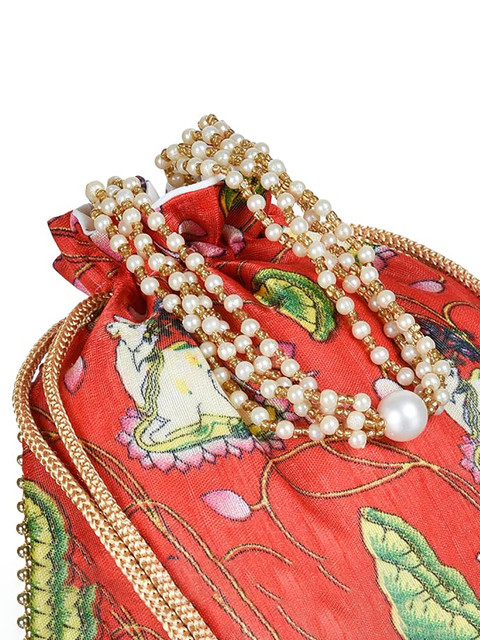 Red, white and green printed potli, has drawstring closure and beads beaded wrist loop