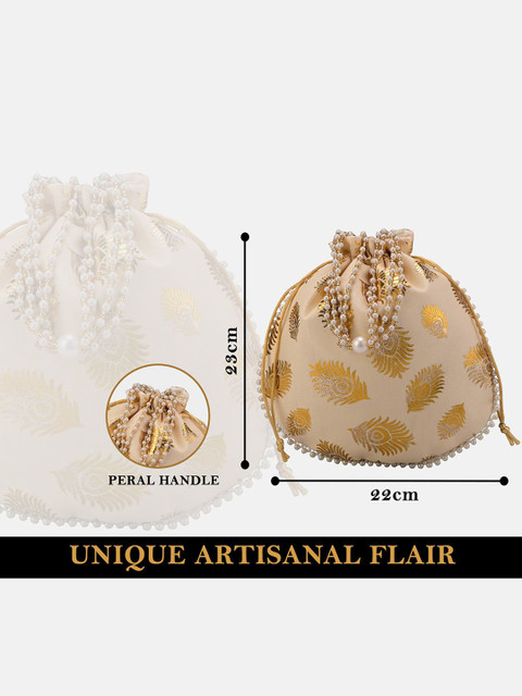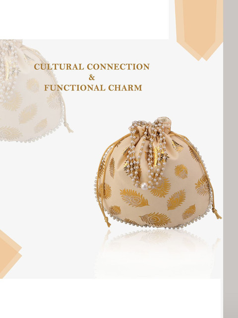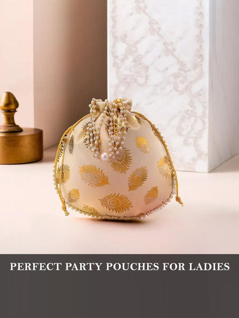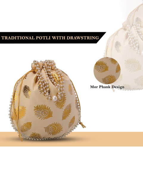 Beige & gold-toned mor phank woven design slik potli bags