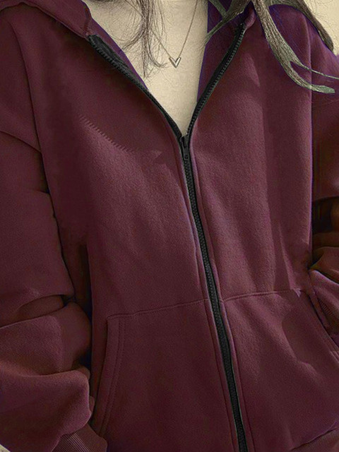 Violet solid bomber jacket, has a hooded, 2 pockets ,has a zip closure, long sleeves, straight hemline, fleece lining