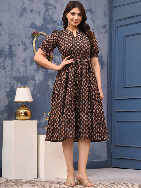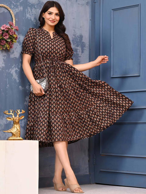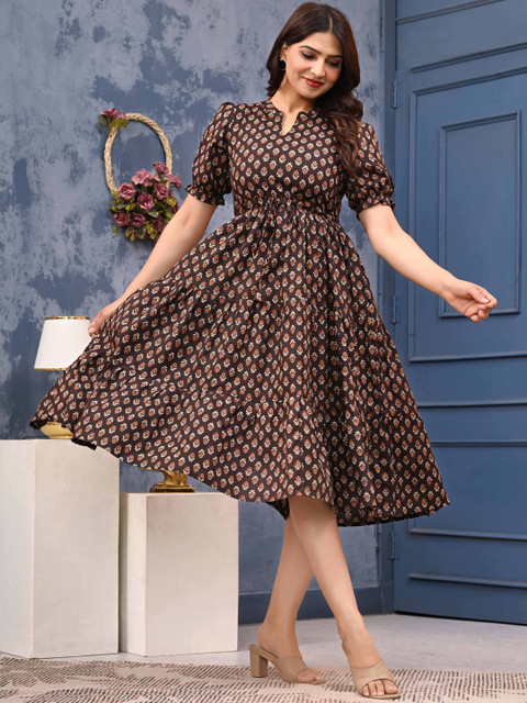 Dress Type:- Midi Pattern:- Anarkali Design:- 3 Layered Pleated Pattern Sleeves Types:- Puff Neck:- Round V-Neck Print:- Floral Fabric:- Pure Cotton Length:- Calf Length Belt:- Adjustable Waist Belt Color:- Coffe Brown