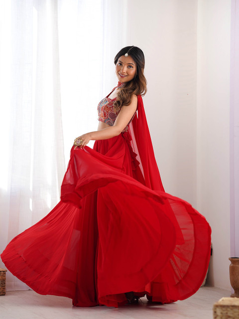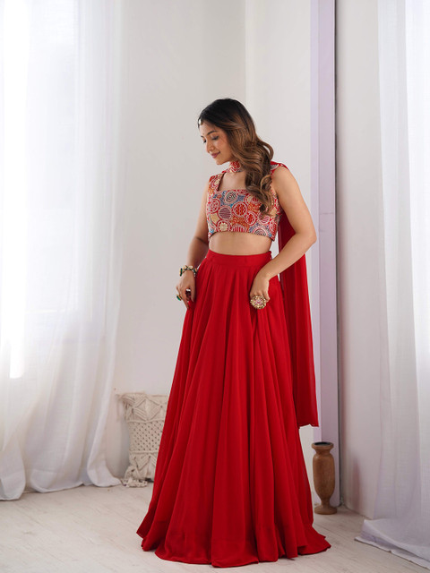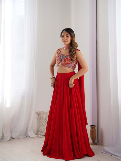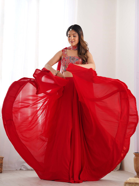 Red and white solid ready to wear lehenga, has slip-on closure, flared hem