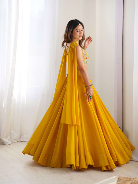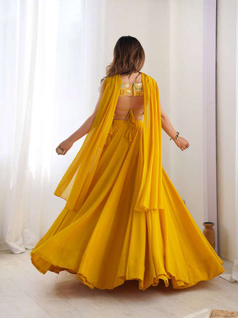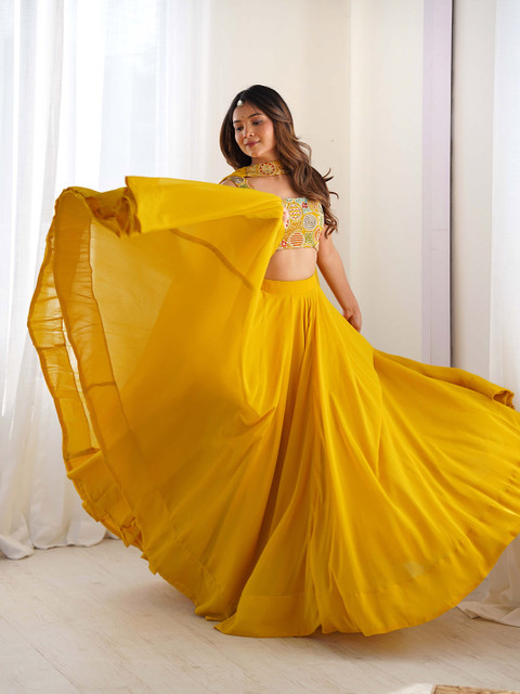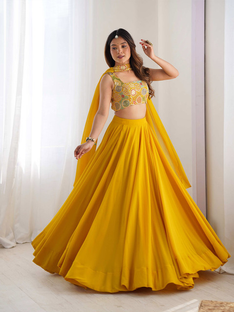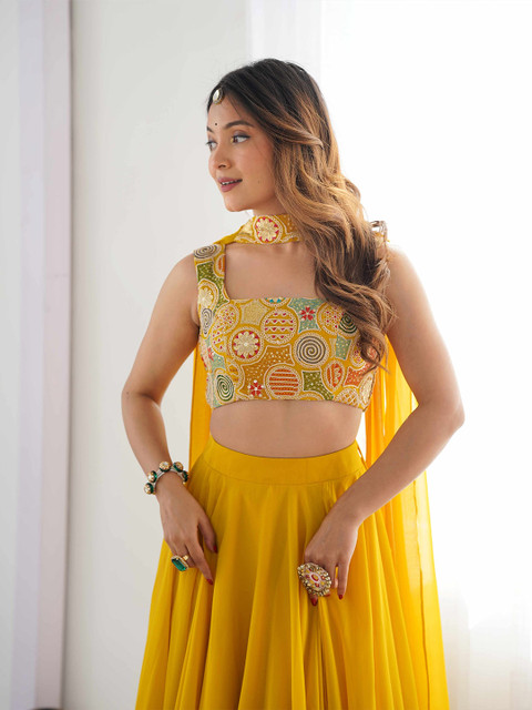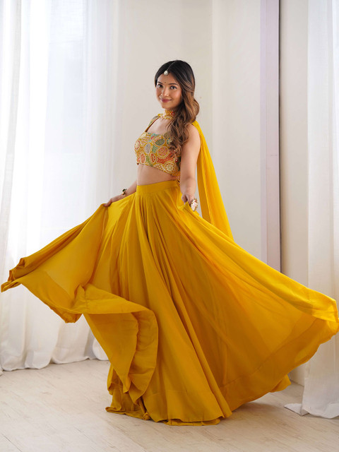 Yellow embroidered ready to wear blouse, has a square neck, sleeveless, yellow solid ready to wear lehenga, flared hem