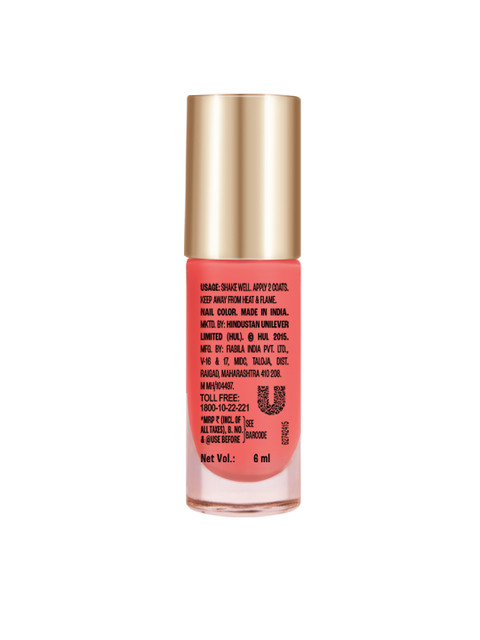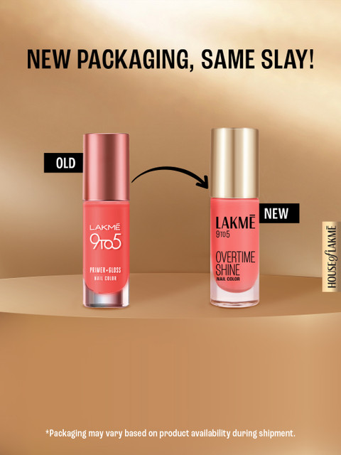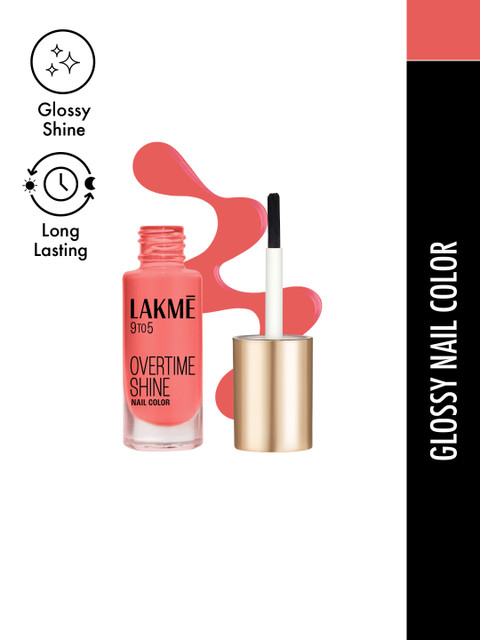 | Benefits | Get everyday perfect nails with Lakme 9to5 Primer + Gloss Nail Colour.The perfect Primer + Gloss Nail Colour range has colours that dry quickly, giving your nails a long lasting, intense, glossy shine.Now coat your nails with vibrant colour that stays through your busy work days.Available in a wide range of 19 bright colours and 1 Top Coat that gives an added glossy finish.A nail paint for everyday use, these shades are simply a must-have! |