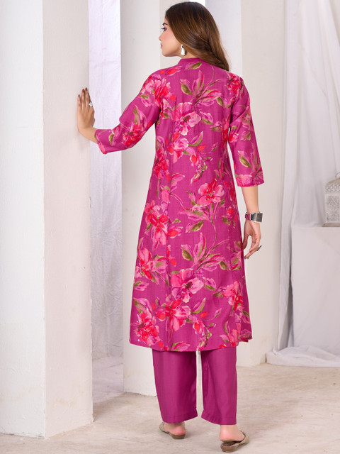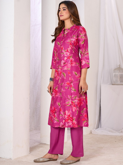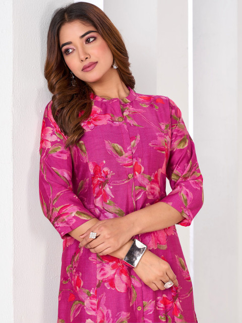 Pink printed top, has a mandarin collar and three-quarter sleeves, secured with button closure