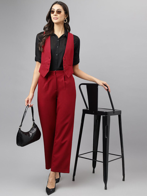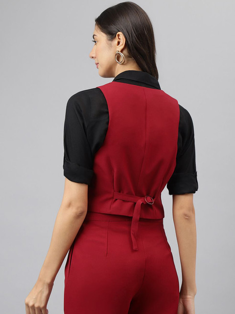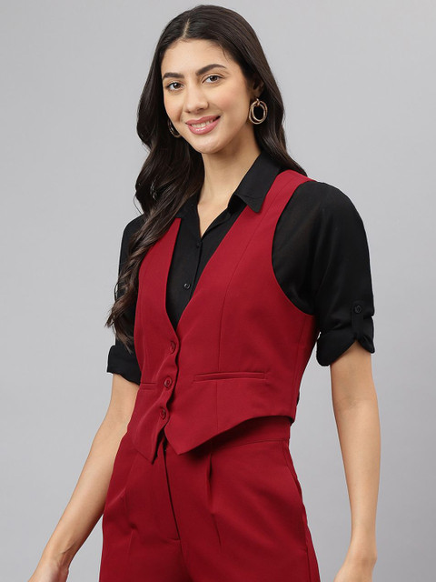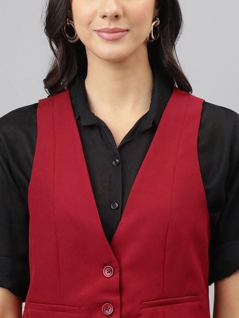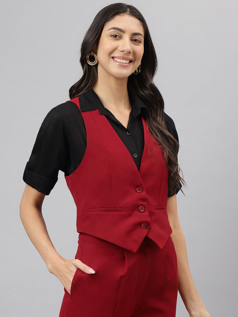 Red solid regular-fit woven waistcoat, has a V-neck, sleeveless, a full buttoned placket, two pockets