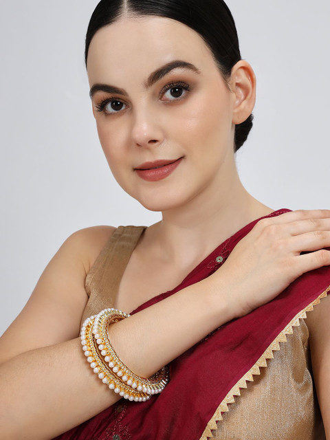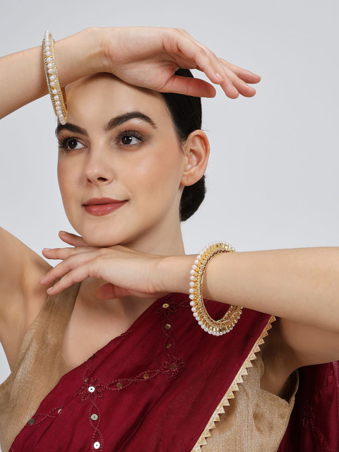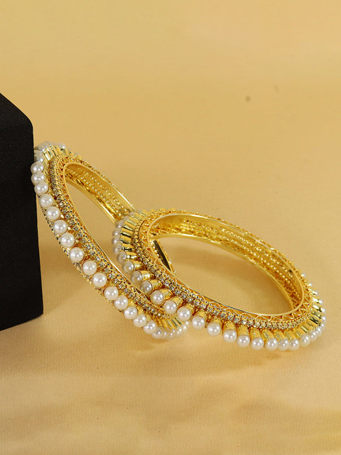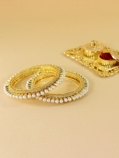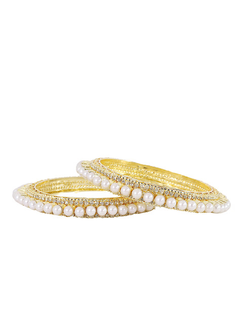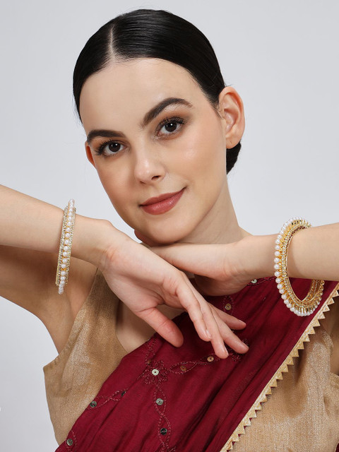 Set of 2 gold-toned bangles, each has white crystal stone-studded and beaded details, secured with slip-on closure