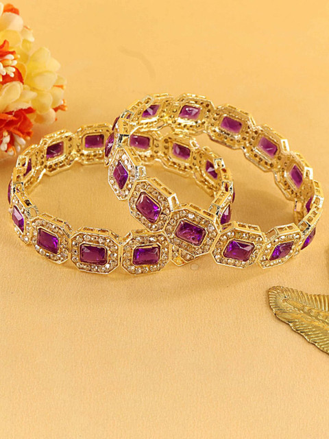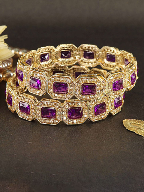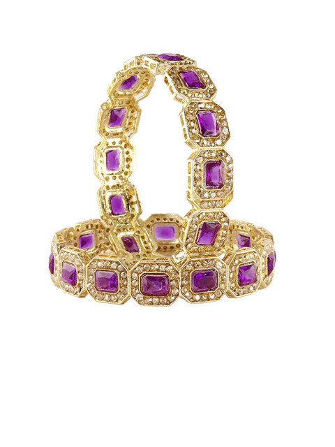 Set of two gold-toned bangles, each has white and purple crystal and zircon-studded details, secured with slip-on closure