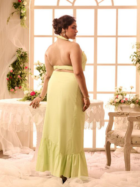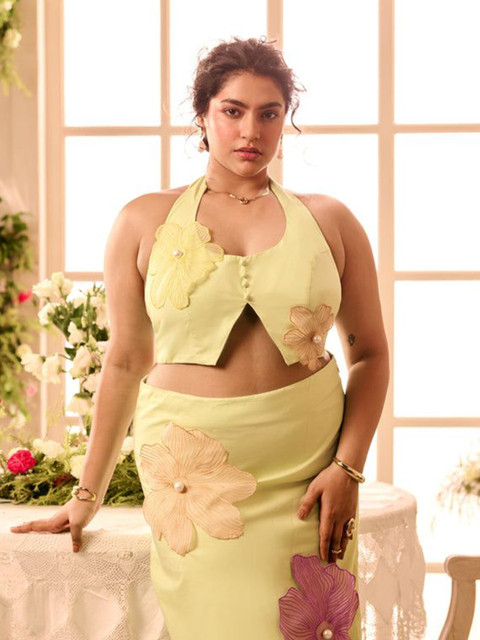Lime green & pink 3D floral printed top, has halter neck, sleeveless ,regular waist hem