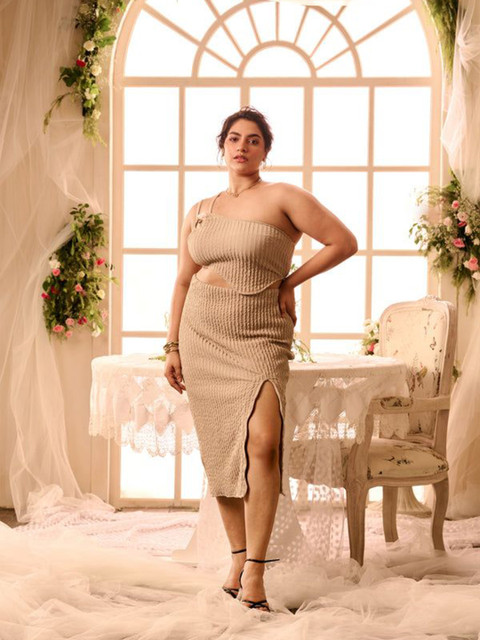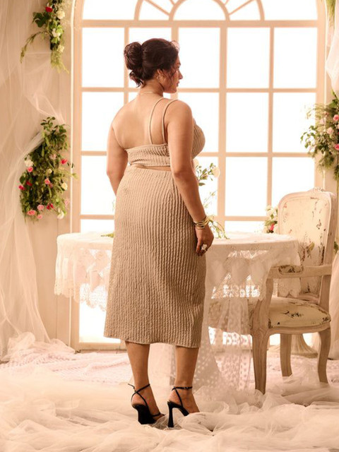 Beige self-design top, has one shoulder, sleeveless ,regular waist hem