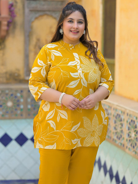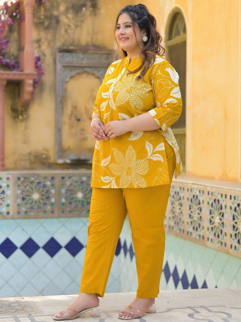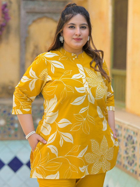 Lee Moda Plus Size Floral Printed Pure Cotton Tunic & Trousers Co-Ord Set