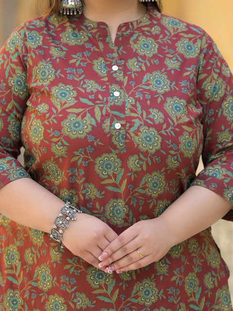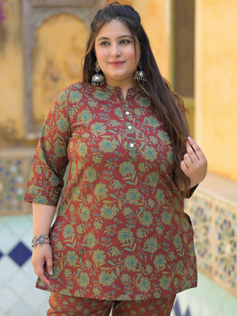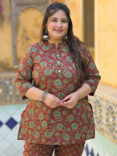 Lee Moda Printed Mandarin Collar Pure Cotton Top With Trousers Plus Size Co-Ords