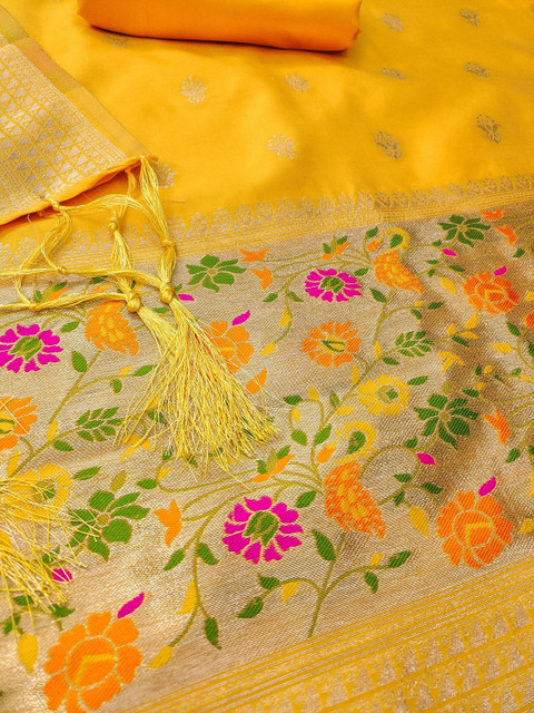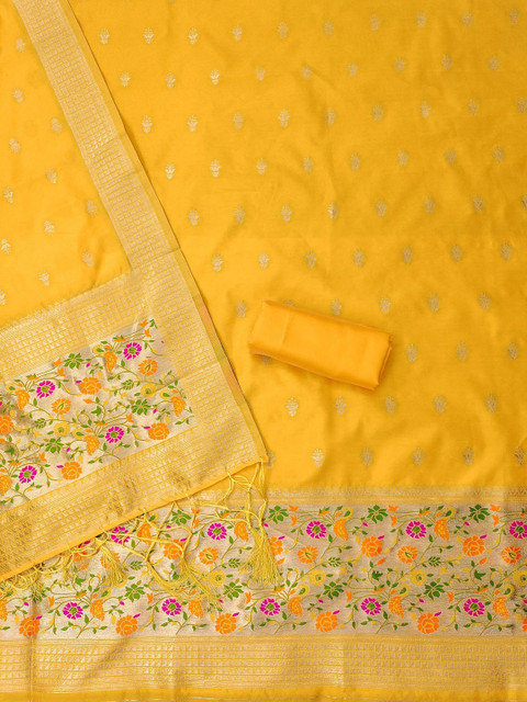 Yellow and gold-toned woven design unstitched dress material