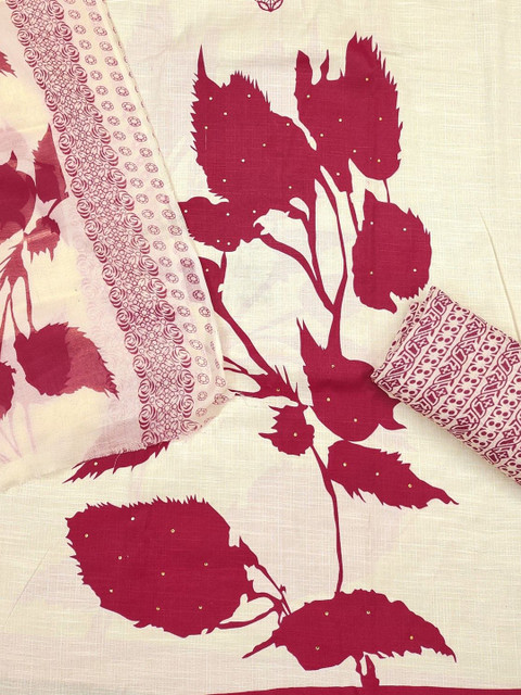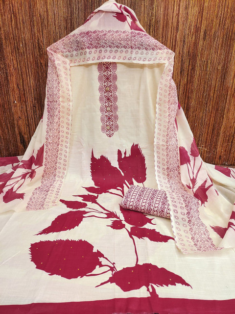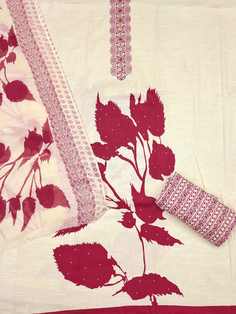 Pink and white printed unstitched dress material