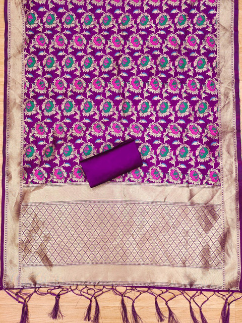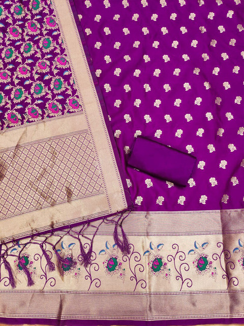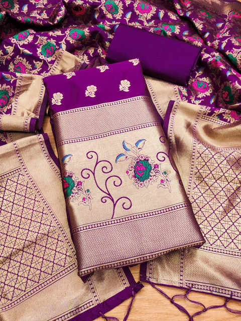 Purple and gold-toned woven design unstitched dress material