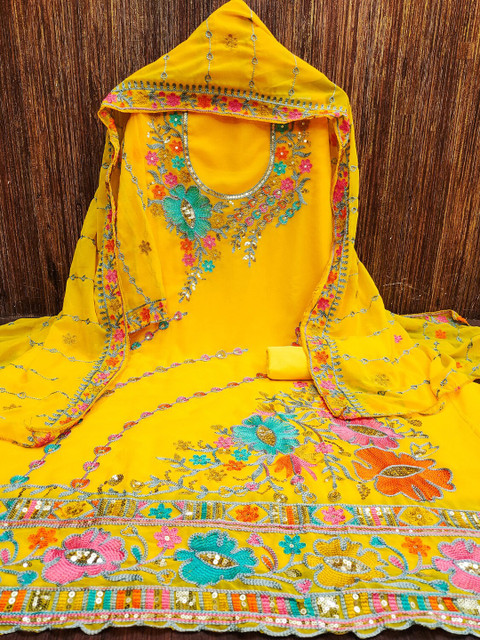 Georgette dress material with beautiful colorful embroidery and long sleeves. The yellow color is slightly darker than the picture which I loved even more. Overall very nice!