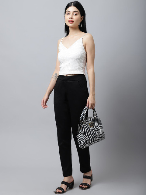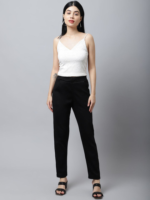 Black solid mid-rise trousers, has a partially elasticated waistband with slip-on closure with 2 pockets