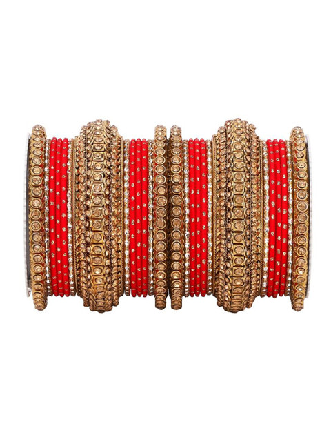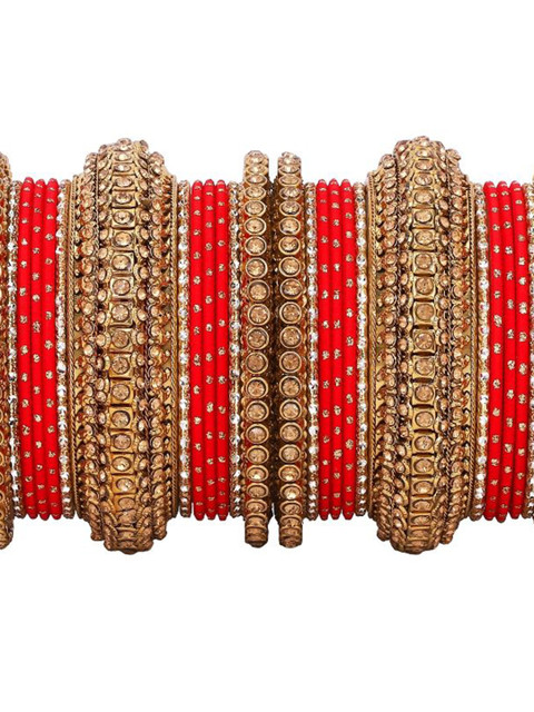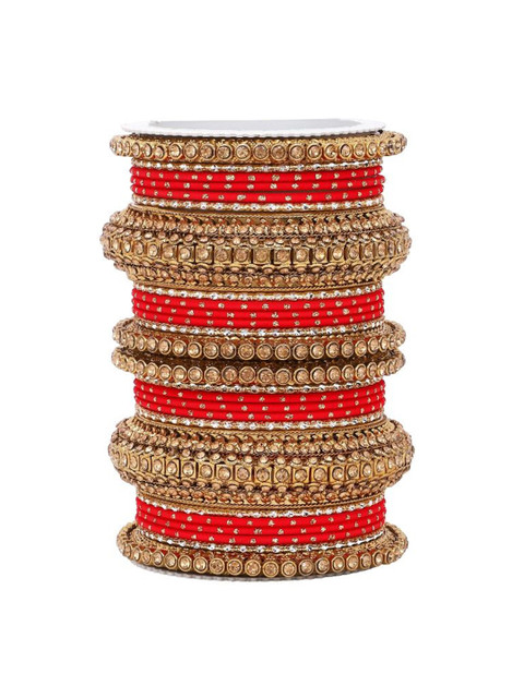 Set of two gold-toned bangles, each has red and white stone-studded details, secured with slip-on closure
